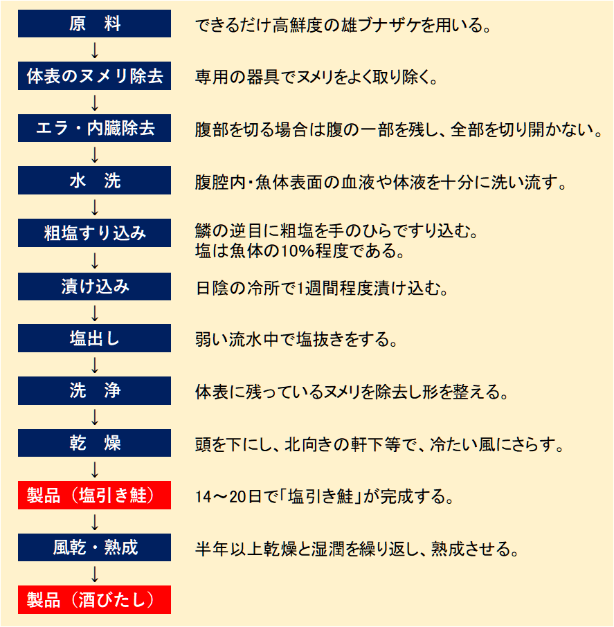 • 原料 サケの漁期である11月中旬から12月上旬にかけて仕込みをする。三面川に産卵のために遡上して間もない雄のブナザケで6~8kgの大型魚体を用いるのが望ましいが、現在では、海で獲れる銀毛の鮭も多く、3~5kgのものも使われるようになっている。