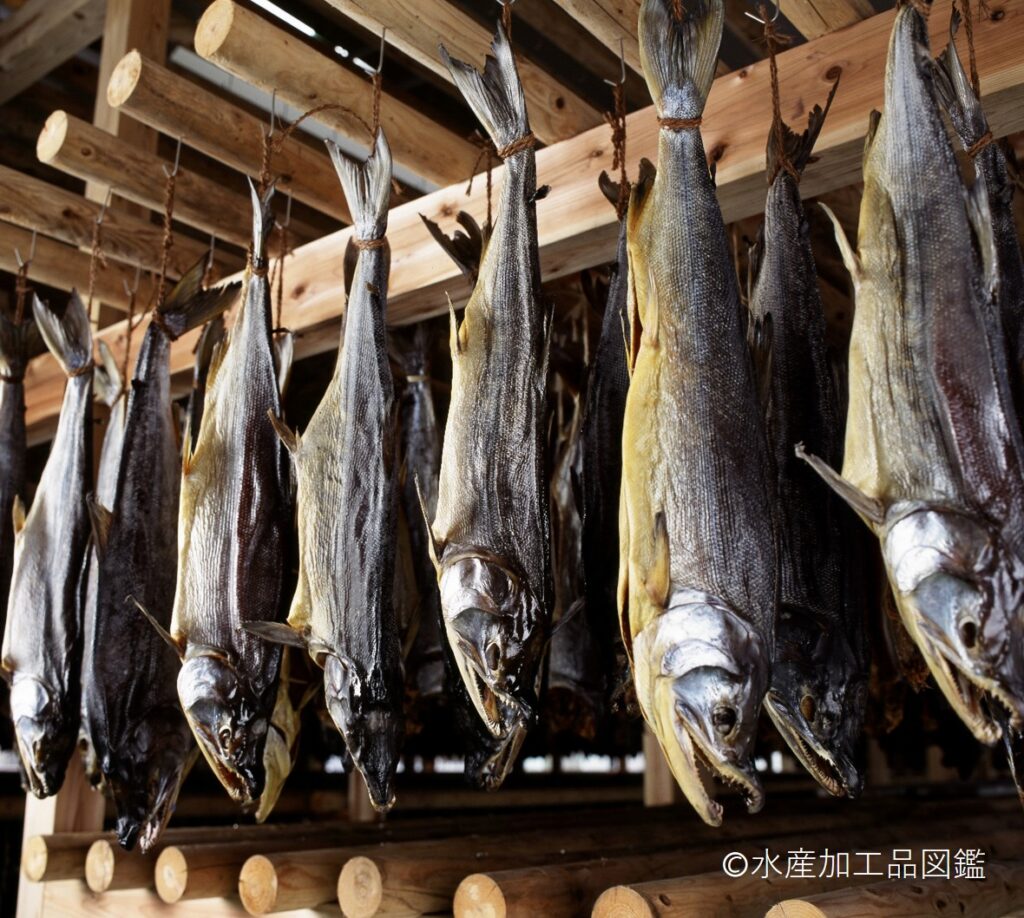 「塩引き鮭」は、鮭を塩漬けして水分を取り除き、塩出しして塩分を調整後乾燥することにより、水分活性を低下させ貯蔵性を高め、旨味を濃縮した加工品である。