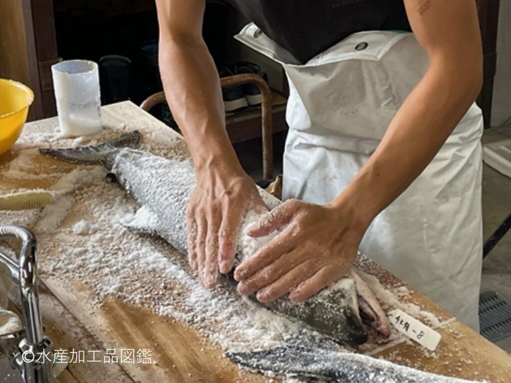 • 漬け込み 塩をすり込んだサケは容器(本来は浅い楕円形の桶を用いたが、現在は発泡スチロール製の魚箱)に横向きに入れ、北向きで日陰となる冷たい場所(日陰の冷所)で1週間程度漬け込む。3~4日後に裏返し、塩が片身だけに偏らず、まんべんなく魚体に浸透するようにする。