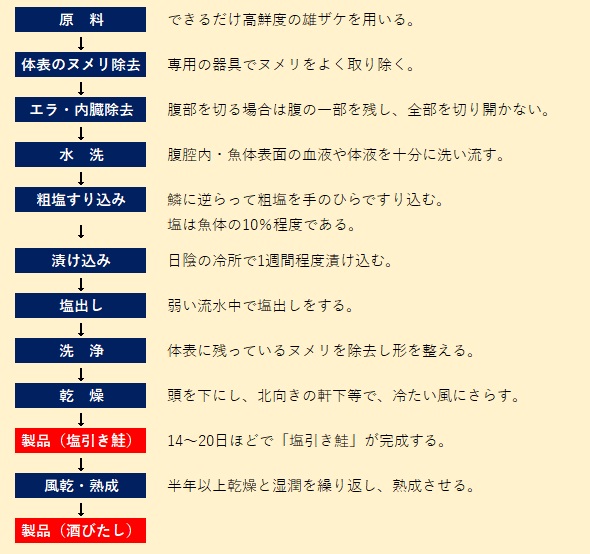 - 原料 サケの漁期である11月中旬から12月上旬にかけて仕込みをする。三面川に産卵のために遡上して間もない雄のブナザケで6~8kgの大型魚体を用いるのが望ましいが、現在では、海で獲れる銀毛の鮭で、3~5kgのものも使われるようになっている。