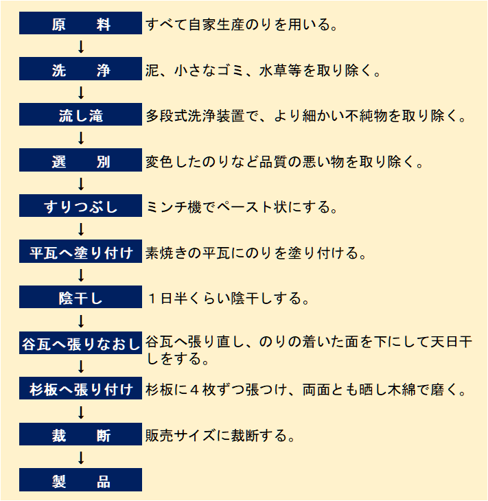 ミンチ機ですりつぶしてペースト状にした藻体を乾燥する。乾燥工程は素焼きの平瓦、谷瓦、杉板などを用いて行い、仕上げはさらし木綿で両面を磨き上げる。全工程は2週間かかる。(写真1,2)