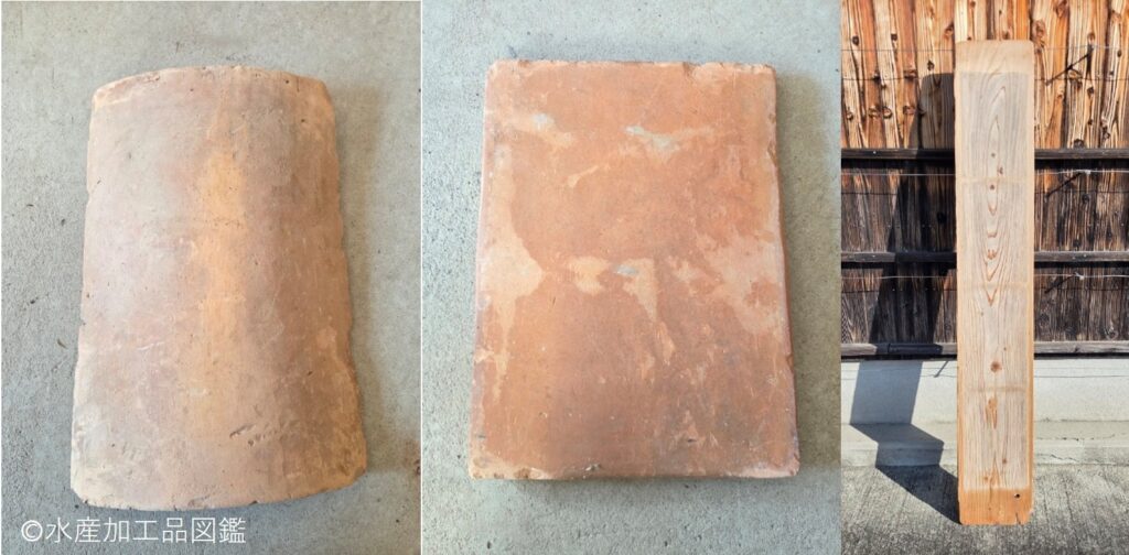 写真1 左…谷瓦、中…平瓦、右…杉板(提供:内水面研究所・遠藤金川堂)