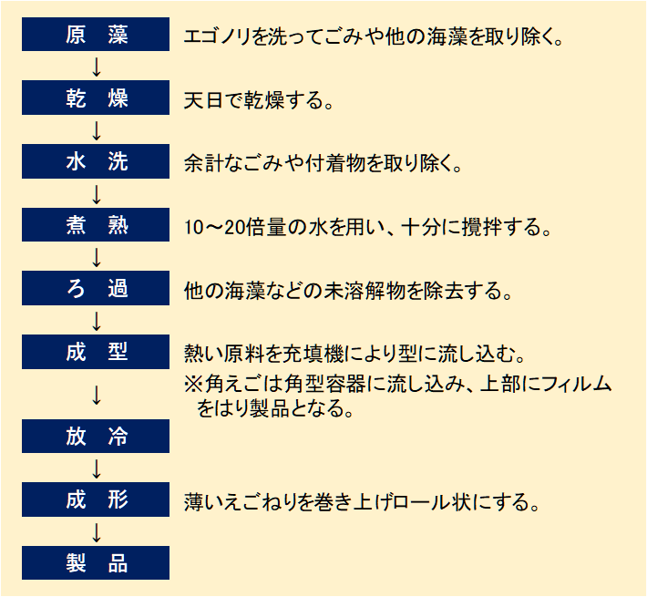 寒天質の多い原藻の選択が重要である。巻きえごではとくにしなやかさが求められるため、加熱ではゆっくりと昇温させ、十分な攪拌を行うことで寒天様物質を十分に溶解することがポイントである。