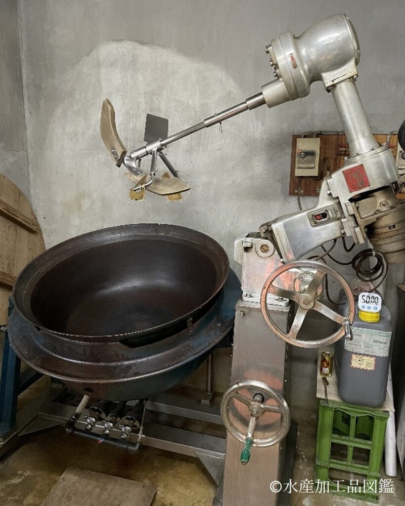 - 煮熟 原料を水からとろ火で沸騰するまで加熱する。溶解を促進するため、場合により食酢などを添加する。“巻きえご”は薄く巻いてあることを特徴とするため、“角えご”よりも折れないしなやかさが求められる。そのため加熱ではゆっくりと昇温させ、十分な攪拌を行うことで寒天様物質の十分な溶解を促進する。