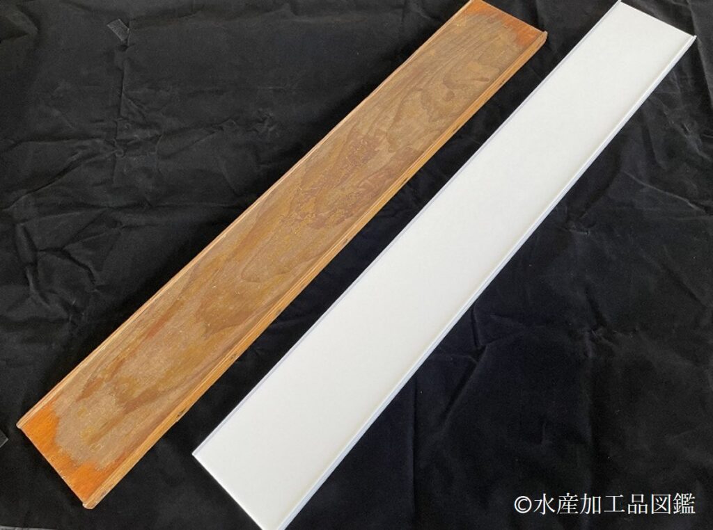 - 成型 “巻きえご’’は、熱い加熱原料を充填機により縦80cm、横15cm、厚さ0.5cm程度の型に流し込み、コテを用いて表面を平らにする。
