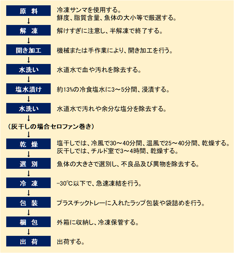 • 塩水漬け 水洗いしたサンマを、冷塩水を張ったステンレス製のダンベなどに浸漬する。塩分は約13%、浸漬時間は約3分間であるが、魚体が大きく脂質含量が高いサンマの場合、約5分間浸漬する。塩水は衛生面を考慮し、毎回廃棄している場合が多い。なお、塩水に抗酸化剤を入れることで、脂質酸化防止を図る場合もある。