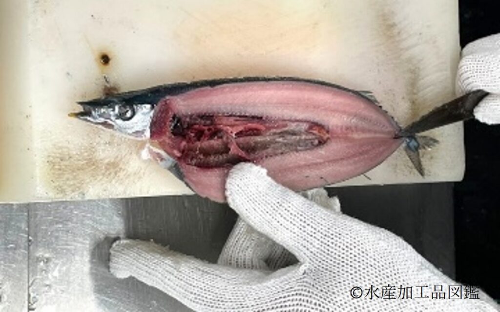 • 開き加工 開き加工は、機械開きが主流となっている(写真3)。機械開きでは、カッターで頭と尾を除去、水平刃で腹部をカット、ブラシで内臓を除去、V字カッターで中骨を除去し腹開き、という工程で加工される。手作業での開き加工は「かぎ開き」と呼ばれ、眼球に釘を刺し包丁で開く方法であり、熟練の技術が必要となる(写真4)。機械化が進んでいることから、熟練の技術を持った職人は減少傾向にある。