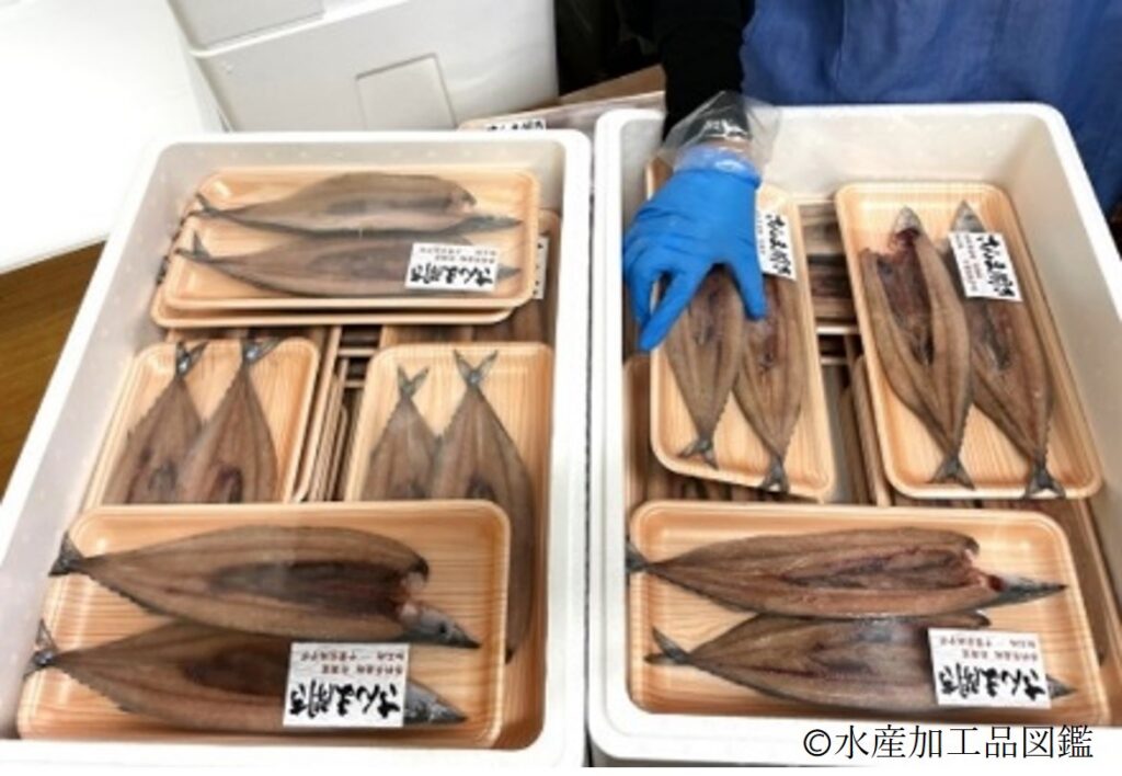 さんま開き干しは、サンマを身開きし、塩漬けしてから乾燥した製品である写真1,2。サンマ本来の味わいを生かした古くからの代表的な塩干品の1つである。近年では、低温技術や包装容器などの発達に伴い、従来の貯蔵性に重点を置いた乾燥度の強い高塩分の製品よりも、低塩分で乾燥度の低い製品が主流となっているため、生鮮魚並みの鮮度管理が必要である。消費者における嗜好性は地域で異なり、都心部では低塩分の製品が好まれ、古くからさんま開きの産地であった銚子市などでは、昔ながらの高塩分の製品が好まれる傾向にある。