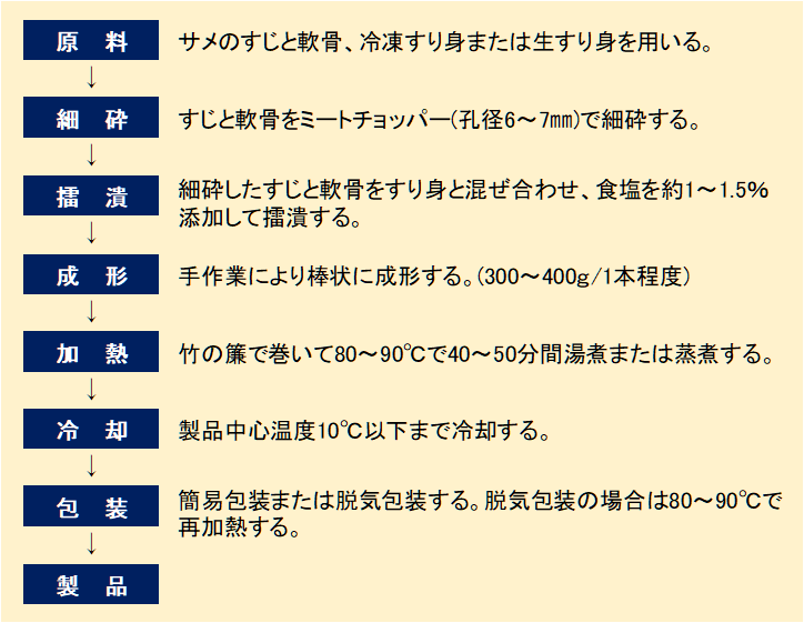 一般的なかまぼこと同様であるが、すじや軟骨を加える点が異なっている。