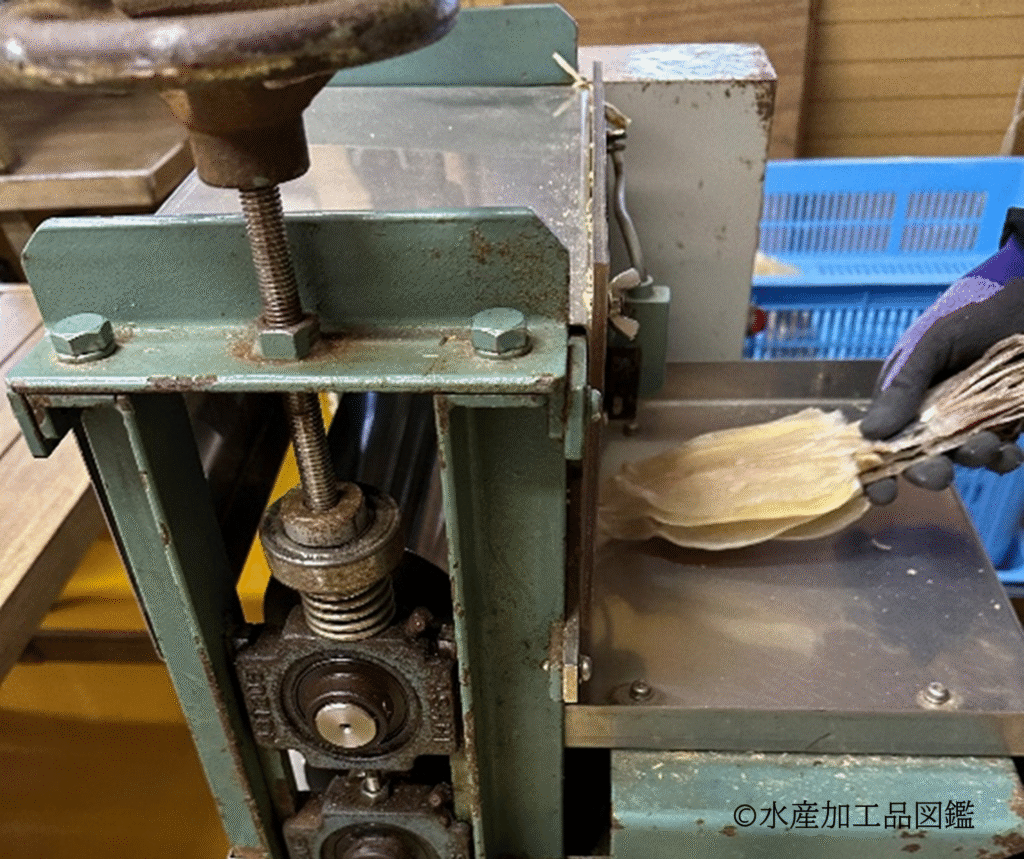 - 乾燥・整形 竹さおなどに張ったロープに吊り下げる。剣先するめの場合、S字型の針金を吊り下げ、これにイカの先端部を掛ける。竹串で胴体を広げ、固定する(写真6)。ある程度乾燥したところで「手割り」とよばれる伸展・整形作業を行い、その後乾燥を再開する(写真7)。乾燥後は手作業による整形を行い(写真8)、再度冷風乾燥機にて乾燥させ、最後にロール機によって伸展・整形を行う(写真9)。
