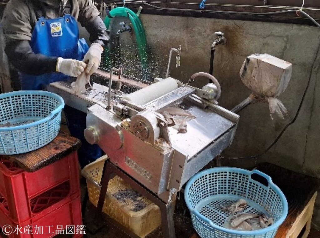 - 剝皮 表皮の剝皮は地域・製品によって異なり、外観を重視する場合に行われる。ケンサキイカでは剝皮が容易であるため、手で剝くことが多い。一方、スルメイカでは皮下の薄皮が剝きにくいため、剝皮機で処理した後(写真4)、残った皮を手作業で除く(写真5)。