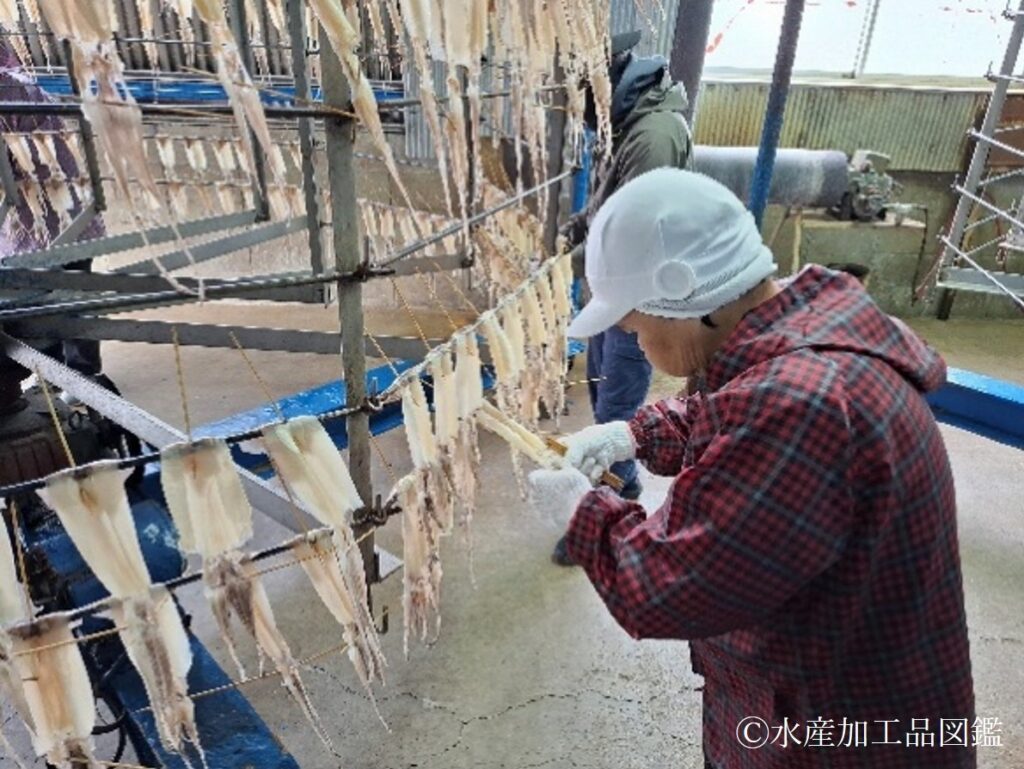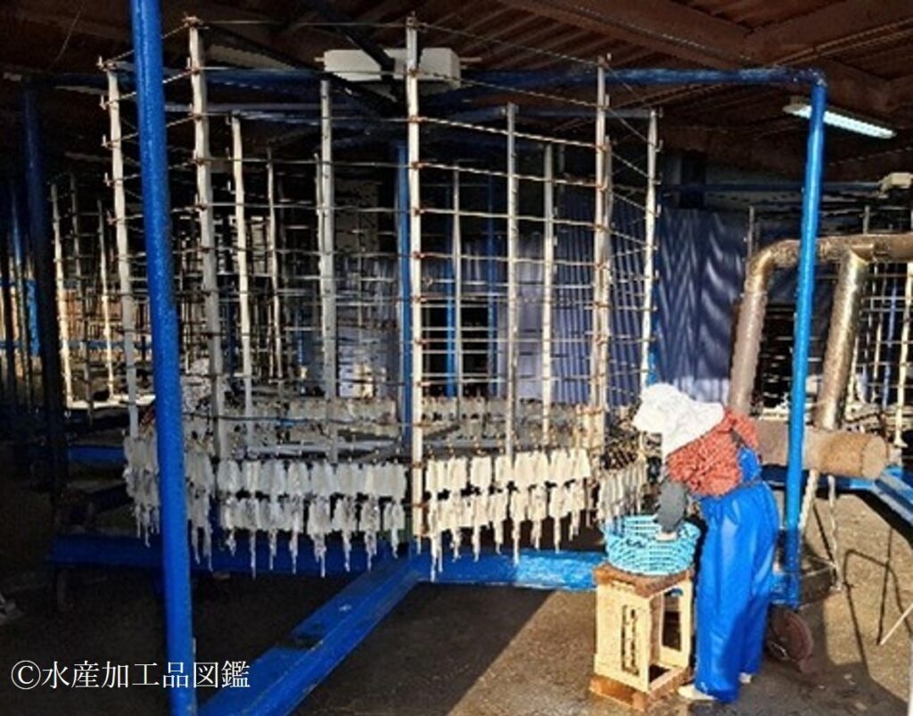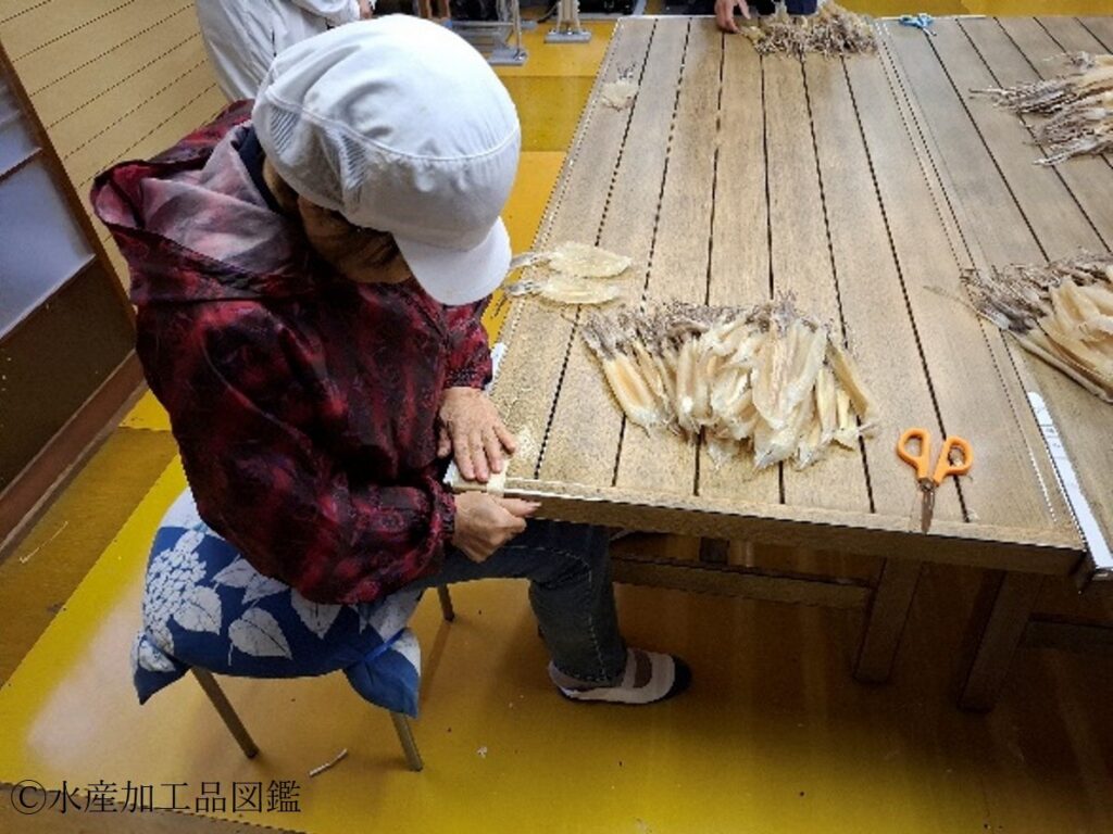 - 洗浄 海水や真水で丁寧に洗浄する。海水で洗浄する場合、塩分の付着によって乾燥が悪く、製品が吸湿しやすくなるほか、光沢も劣るという。そのため、最後に真水で塩分を洗い流すのが理想とされ、特に剣先するめは真水で洗う。