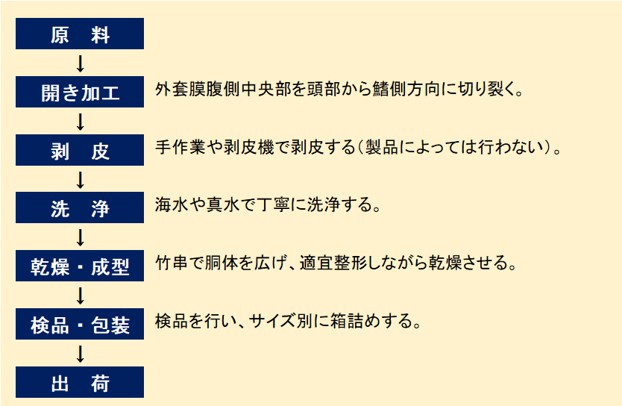 - 原料 生鮮原料の場合、鮮度良好で透明感のあるものが良い。冷凍原料も使用される。