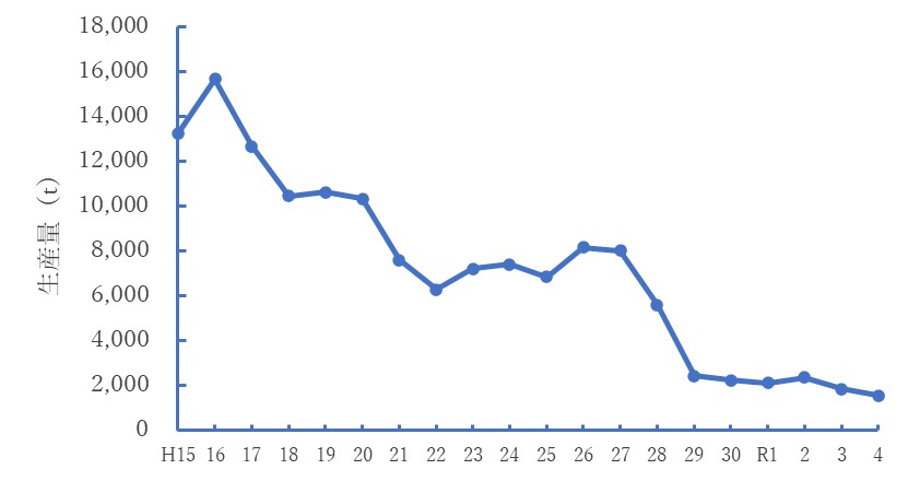 平成15年から令和4年までの全国のするめ生産量の推移を図1に示した。近年の生産は、平成16年の15,668トンをピークに、令和4年には1,549トンまで減少している。この背景には、主な原料であるスルメイカの不漁がある。