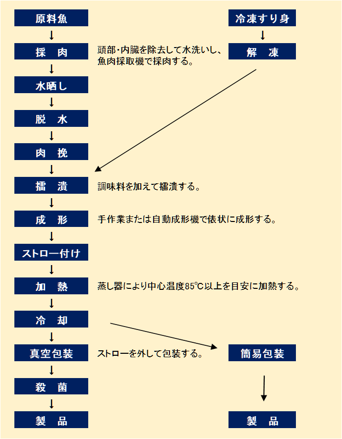 地魚や冷凍すり身から調製した肉糊を、手作業または自動成形機で俵状に成形し、ストローを巻きつけて蒸煮する。