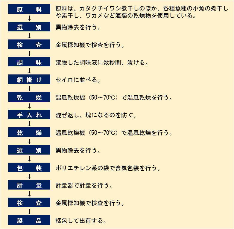 • 原料 原料は、カタクチイワシ煮干し(写真2)のほか、小エビ、カレイ、小アジ、キビナゴ、小タイ等の小魚の煮干しあるいは素干しや、ワカメなどの乾燥物を使用している。小魚の煮干しや素干しは、瀬戸内海産を始めとした国産の原料を主に使用しているが、中国、東南アジア各国等からの輸入原料も使用している。