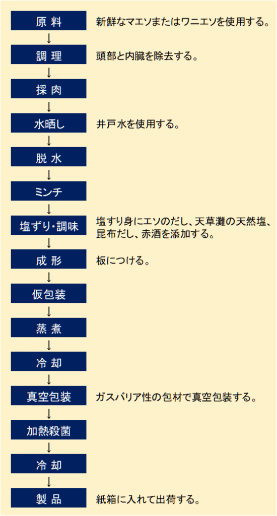 - 原料 新鮮なマエソまたはワニエソを使用し、漁獲されて3日で製品となる。