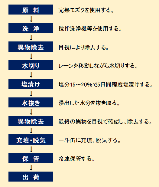 • 塩漬け タンクに投入されたモズクは、モズク重量の15~20%の食塩を添加し、全体に食塩が行き渡るように十分に混合する。混合後は密閉して5日程度漬け込む。漬け込みが進むに従い、モズクから水分が浸出する。なお、塩分を添加しすぎると、モズクが柔らかくなり溶けるような現象が起こる場合がある。