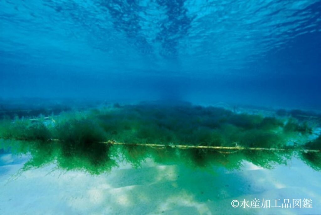 モズクと称されている海藻にはイシモズク、オキナワモズク、クロモなど数種類がある。日本のモズク生産量の内99%以上を沖縄県で生産しており、そのほとんどが養殖されたオキナワモズクである写真2。オキナワモズクは南西諸島の固有種であり、太さ1.5~3.5㎜と他のモズクよりも太く、粘質物質にも富んでいる。