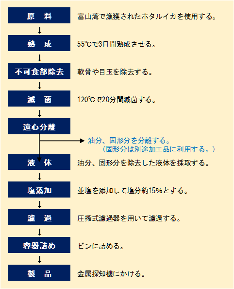 一方、本製品は、原料のホタルイカを高温条件下(55℃)に静置して自己消化酵素(プロテアーゼ)の活性を高めることにより、熟成期間を大幅に短縮し、数日間で完成させる製法で製造されている。高温(55℃)下では、微生物汚染が回避できるため、原料魚を塩漬けにする必要がなく、工程を効率化できる。また、低塩分(無添加)下では、プロテアーゼの活性が高塩分下よりさらに高くなる利点もある。高温・低塩分条件下において魚醬油を製造した後、常温で長期保存させるために塩を添加して製品とする。