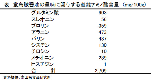 微生物による発酵工程がないため、アレルギー様食中毒の原因物質であるヒスタミンの蓄積量が少ない。蛍烏賊醤油の特徴としては、ホタルイカの肝の風味やうま味が感じられる。